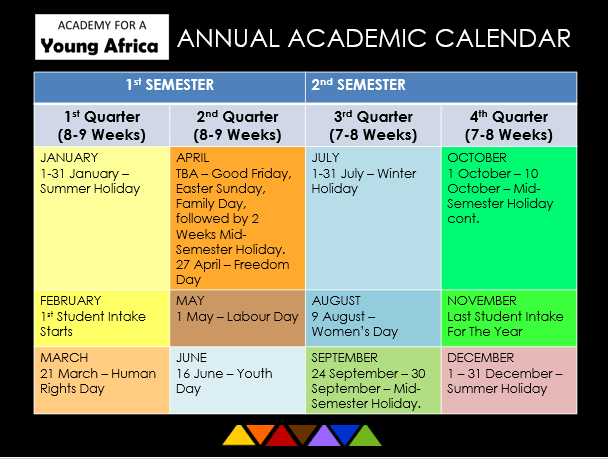 A LEAP Student may register and start studying at any time, except during the ACADEMY For A Young Africa’s Term Holidays. Please look at the Annual Academic Calendar below to see when the ACADEMY For A Young Africa has its Term Holidays. During the Term Holidays, students are ‘on holiday’ from assignments, but the expectation is that even during this time students will be involved in practicing their leadership and entrepreneurship skills, through practical work. These Term Holidays are also necessary to ensure ongoing training of the staff working at the ACADEMY For A Young Africa, or one of the Satellite Campuses of the ACADEMY.