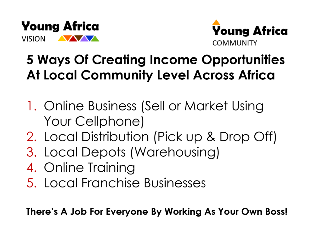 Inspired by both Dr Thokozile Chitepo’s emphasis on Systems Thinking, and Dr Vuyo Mahlati’s commitment to socio-economic development along the Value Chain, the Founder of the Young Africa VISION, Reinhild Niebuhr, has worked since 2013 to develop 5 Basic Local Business Opportunities which can create income opportunities for practically every single one of Africa’s 200 million unemployed youth – and their families – on a local, community level. These opportunities are: