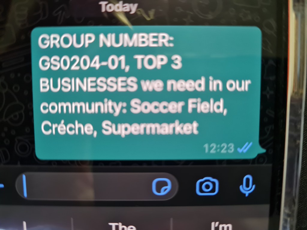 The SECRETARY must take notes by writing down the TOP THREE from each Group, as they are giving feedback, and send this information by WhatsApp to the Course Facilitator, who will be forwarding it to the ACADEMY For A Young Africa Head Office. PLEASE REMEMBER to add your Study Group Number to the WhatsApp! Here is an example of how the WhatsApp must look like: (This is just including feedback from one Breakaway Group):